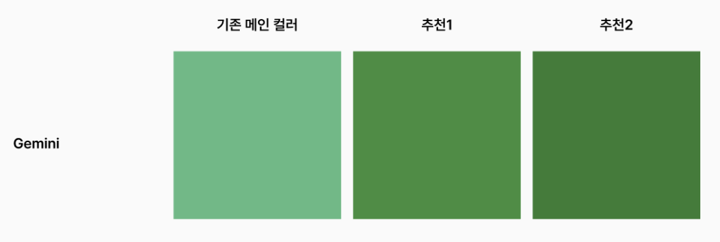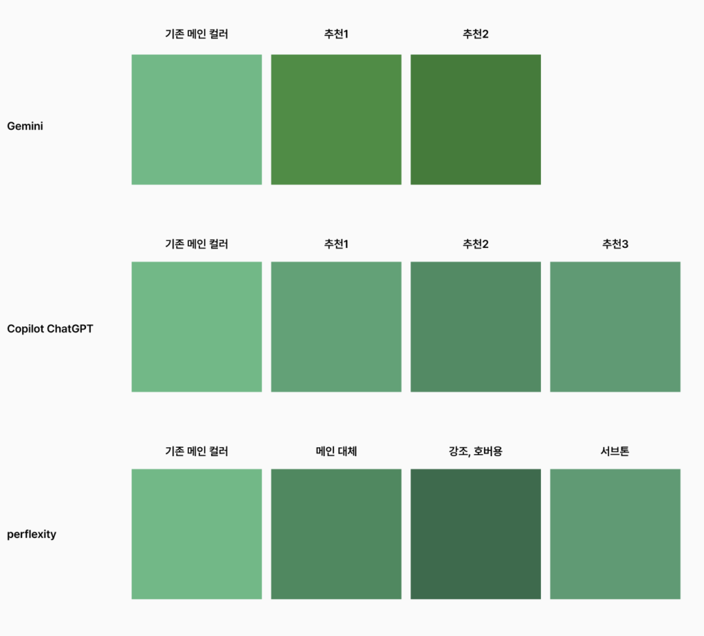 세 개의 LLM 모두 처음에 요청 했던 메인 컬러의 대비가 부족하다는 피드백이 있어서 명도를 낮춘 컬러 추천을 요청 해봤습니다. 처음 메인 컬러인 #59BA83은 산뜻한 중간 톤의 녹색 계열인데 각 LLM이 어떤 결과를 보여줄까요?