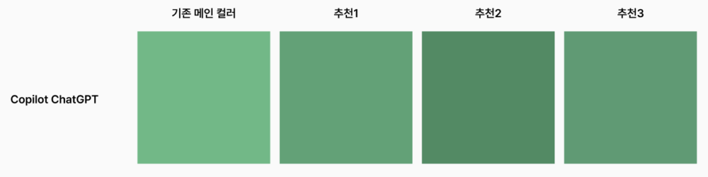 GPT도 명도를 조절했지만 제미나이보다 명도 차이가 크지 않고, 처음 컬러와 유사한 중간 톤의 녹색을 추천합니다.
