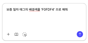 직접 테스트하며 적용한 컬러와 조금의 차이가 있네요. figma make도 gemini와 마찬가지로 기계적인 해석으로 적용을 하는 건 어쩔 수 없는 것 같습니다. 수정할 부분을 정확하게 지정해서 요청하려면 make가 만든 리액트 코드를 읽어야 하는데 코드에 대한 이해가 없으면 이 방식으로는 어려울 수 있습니다. 결국 처음에 적었던 정의서 내용처럼 ‘보증 일자 태그’라고 지칭하여 요청하는 수 밖에 없습니다.